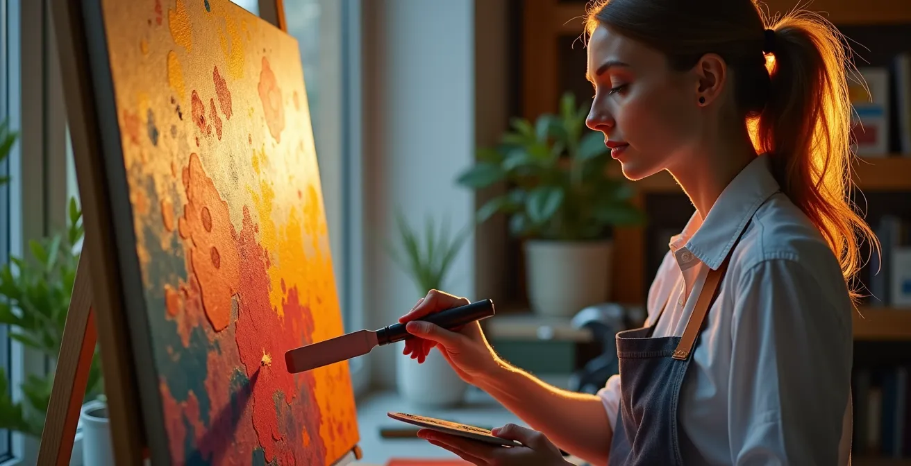 Dieser Ansatz umgeht den analytischen Verstand und spricht direkter die intuitiven, emotionalen Hirnareale an. Anstatt zu denken: „Dieser Strich ist falsch“, konzentriert sich der Geist auf das Gefühl, wie der Spachtel die dicke Farbe über die Leinwand zieht. Dieser Wechsel von kognitiver Kontrolle zu sensorischer Erfahrung ist der schnellste Weg in den sogenannten Flow-Zustand. In diesem Zustand versinkt man vollständig in einer Tätigkeit, vergisst die Zeit und die Sorgen des Alltags. Die mentale Energie wird von grübelnden Gedanken abgezogen und auf den kreativen Prozess umgelenkt, wie auch viele Künstler schnell in einen tiefen, meditativen Flow-Zustand geraten. Das Spachteln wird so zu einer Form der aktiven Meditation, die das Gehirn zwingt, vom Arbeits- in den Spielmodus zu wechseln.